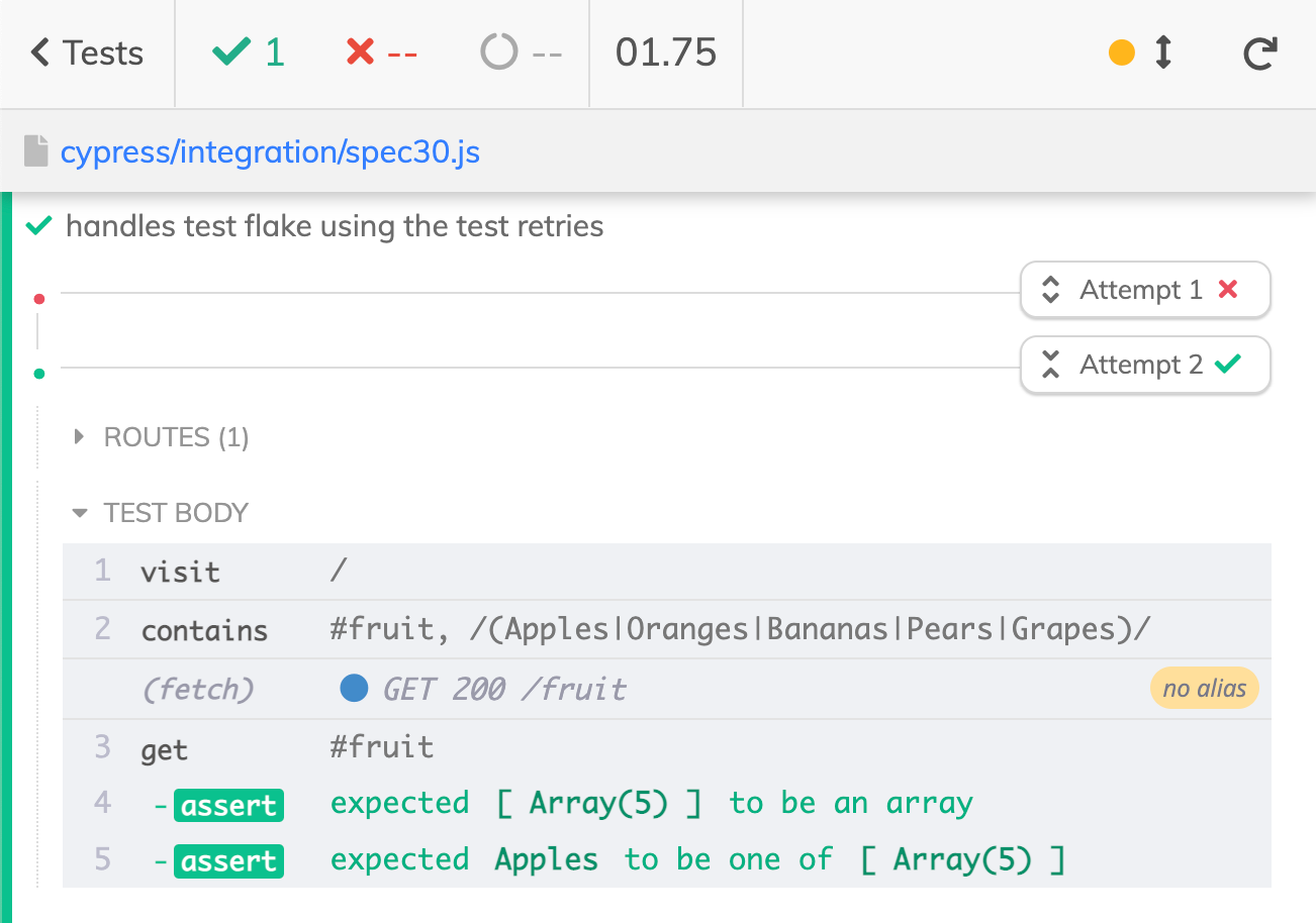 Sometimes the test fails and immediately passes on the next try. Cypress calls such tests “flakey” and has a built-in feature “test retries” to automatically deal with them. It is an opt-in feature; it lets you avoid blocking the CI pipeline without ignoring such random failures. Today, we will practice using test retries to get over simulated network failures. Try implementing “Spec 30: Handles test flake using the test retries” test.