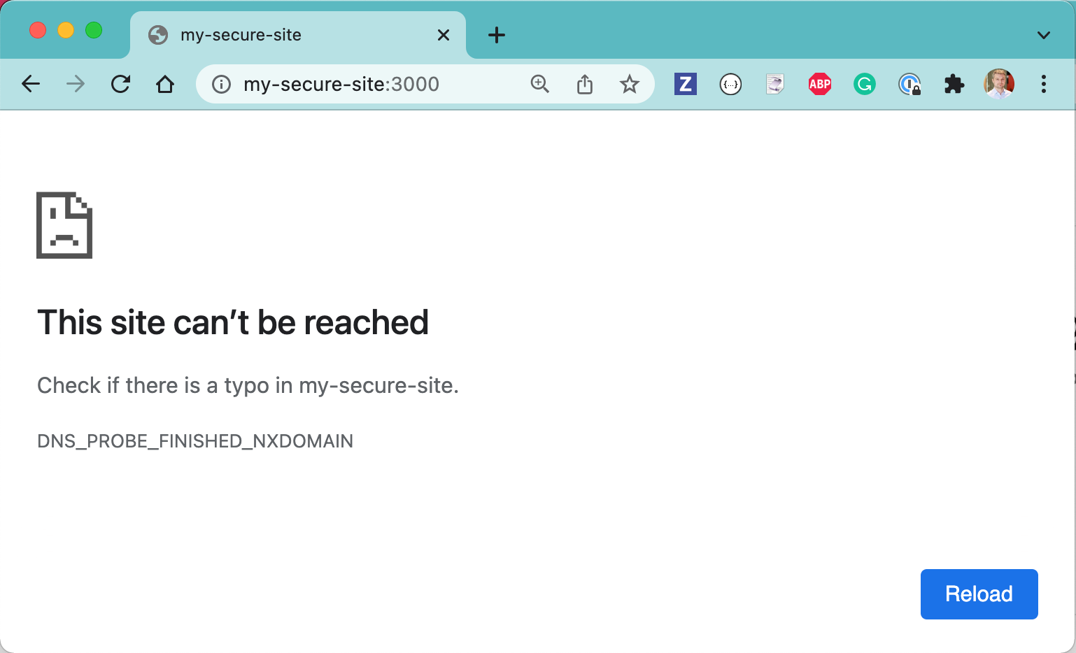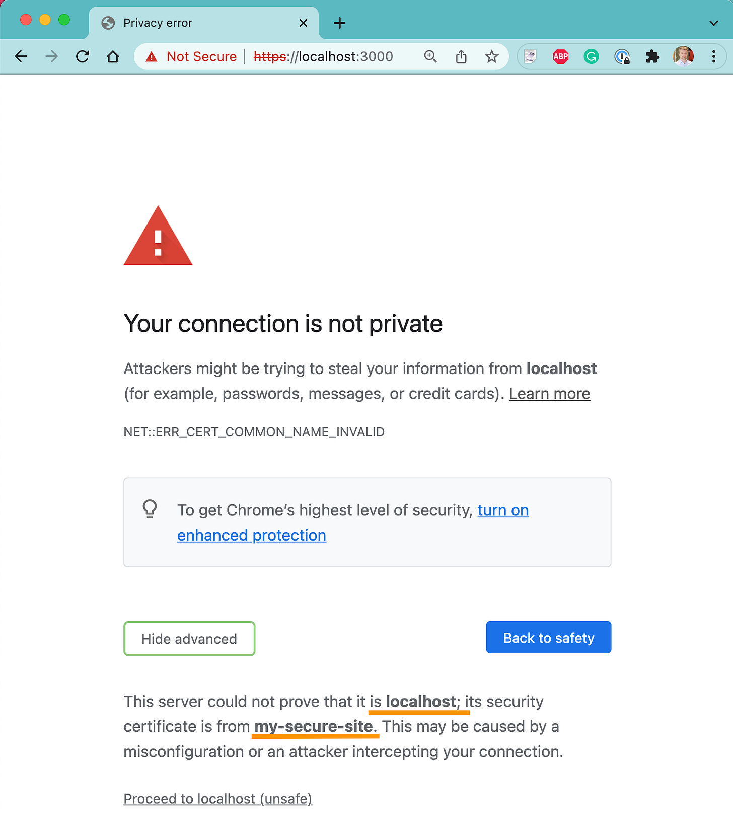 SSL_KEY_FILE=./.cert/key.pem npm startThe browser has no idea where the “my-secure-site” is running. It certainly does not look at the IP address 127.0.0.1:3000 where it is running.