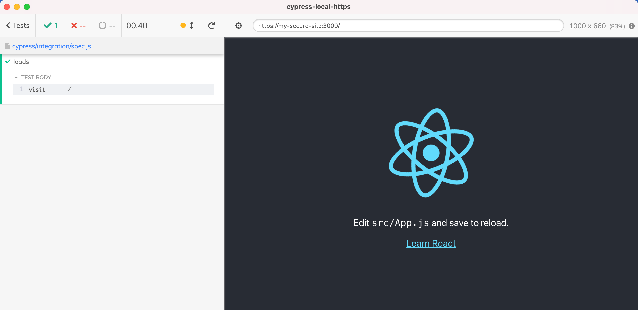 }Open Cypress and run cy.visit(‘/’) - boom, the test is happily running against the local HTTPS site.