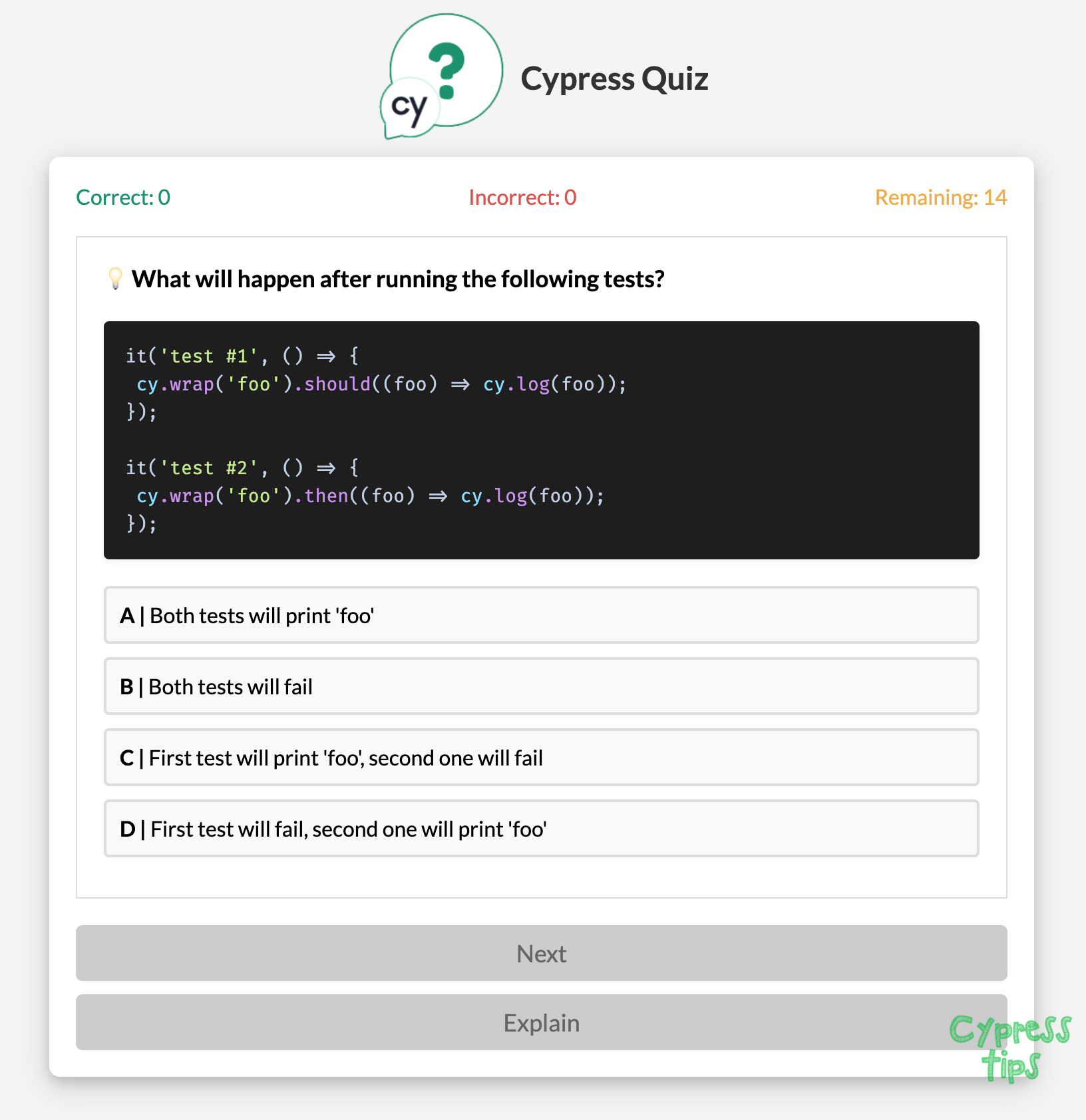 Yevhen Laichenkov created a nice online advanced Cypress Quiz. Check it out, you will learn something new. Every question has an explainer, which is great.