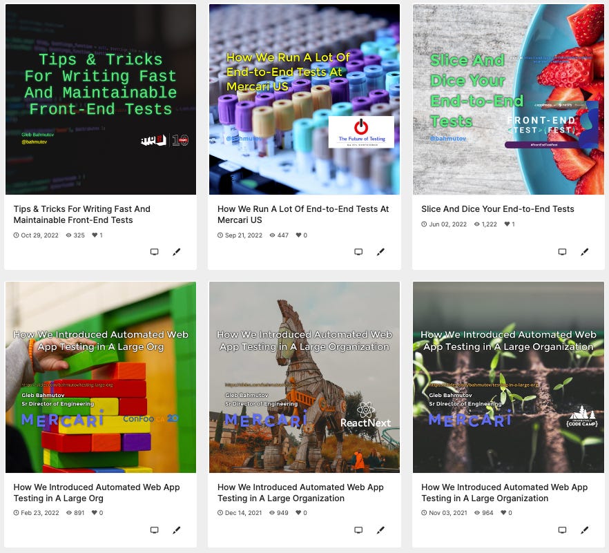 I have made one more presentation about how we do testing at Mercari US, check it out: “Tips & Tricks For Writing Fast And Maintainable Front-End Tests”. This is the 6th presentation about my team’s approach to web testing and running many tests. Find the slide decks at https://slides.com/bahmutov/decks/mercari.