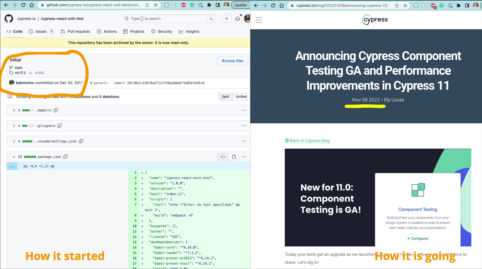 The component testing has changed only a little over the years. The main feature - mounting the framework component and testing it like a real mini web application remains unchanged. I showed the early version of the component testing at AssertJS in 2018, find the slides here, the current production release really reflects my vision. My favorite people explain the component testing in practice in these two videos from TestJS Summit: