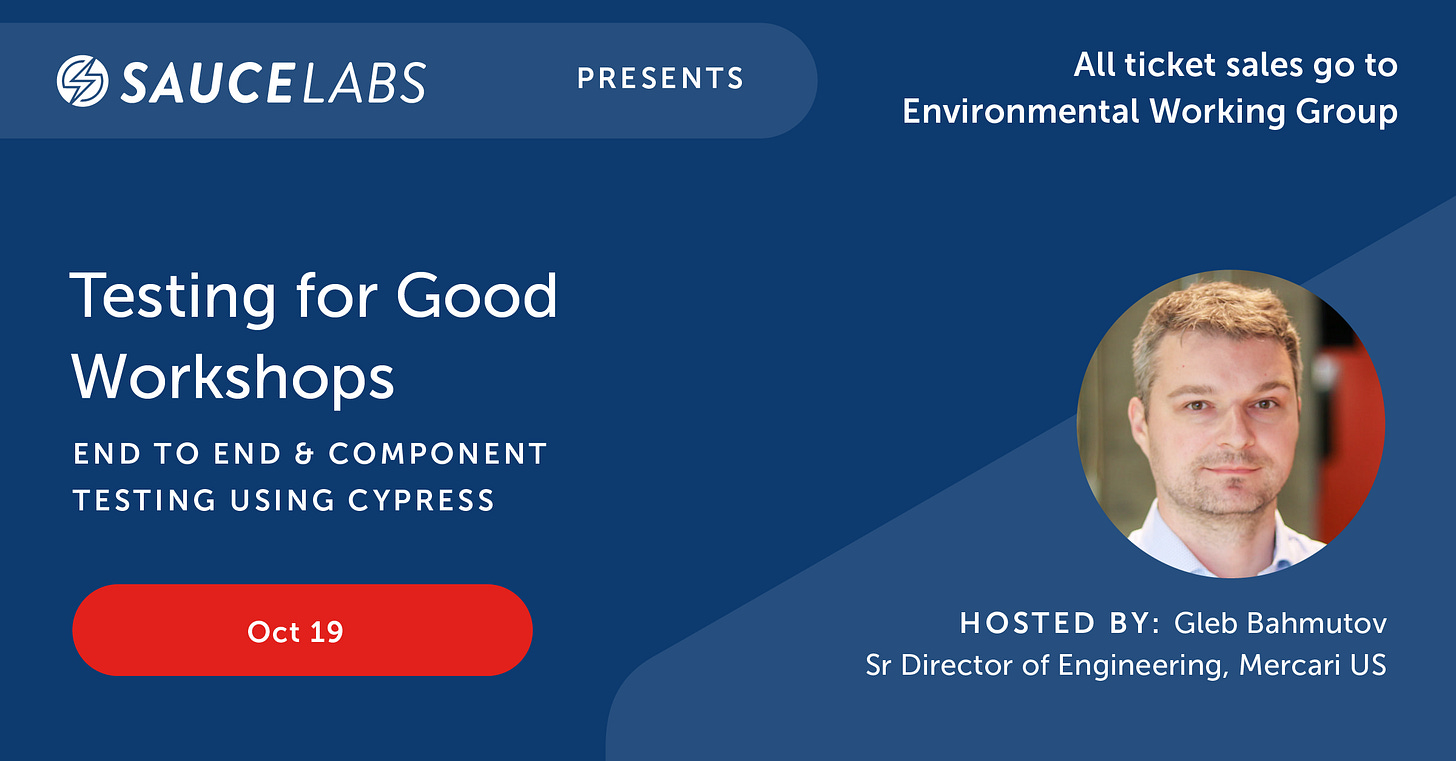 I invite everyone to attend my Cypress online workshop next week at “Testing For Good” https://hopin.com/events/testing-for-good-workshops/registration. Donations are appreciated and go towards environmental goals.