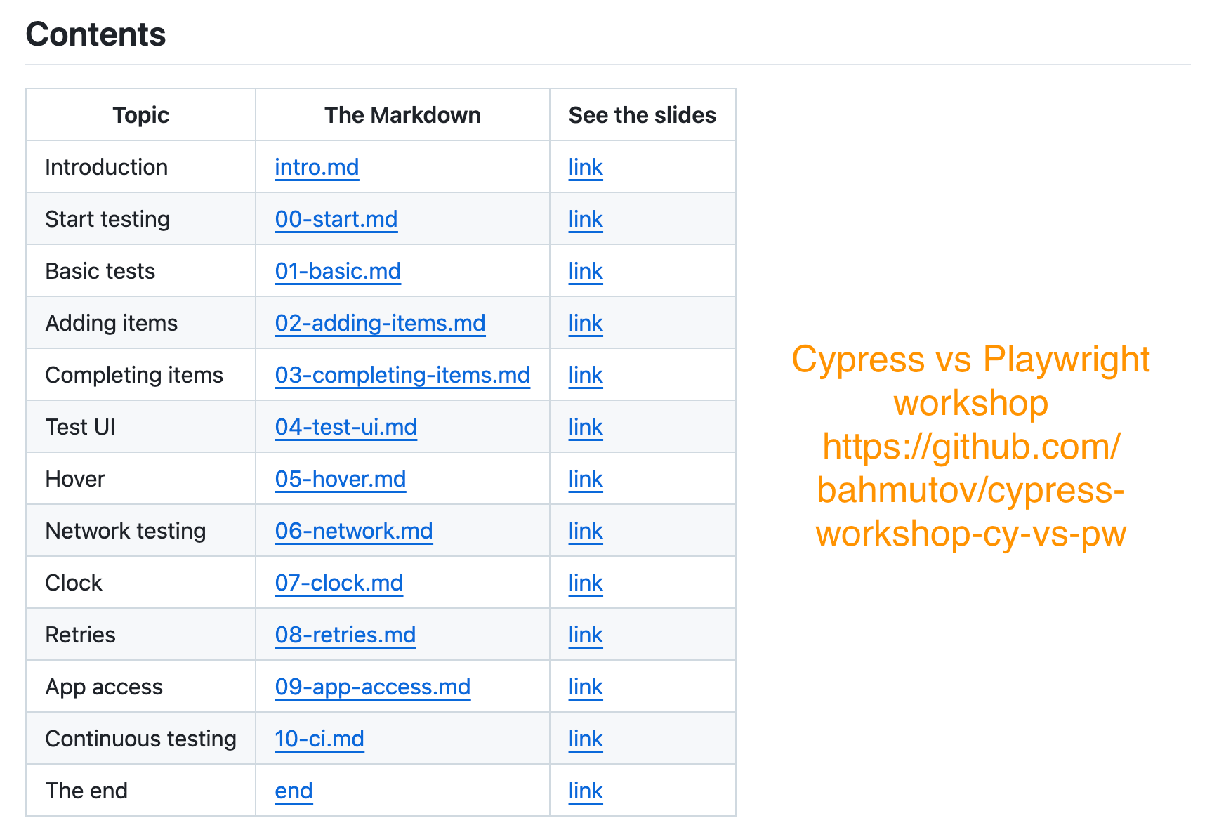 I have updated and released the full open-source “Cypress Vs Playwright” workshop. Find the markdown content at https://github.com/bahmutov/cypress-workshop-cy-vs-pw, the hosted slides at http://glebbahmutov.com/cypress-workshop-cy-vs-pw, and the example application at https://github.com/bahmutov/cy-vs-pw-example-todomvc. The workshop goes through several testing exercises: UI testing, API requests, clock control, etc. You get the starting code for each exercise and need to write the solution to each exercise using Pw and Cy test runners. Which solution do you like better? Try it!