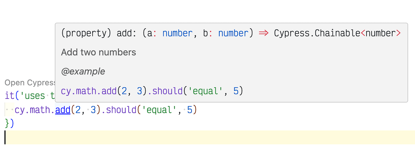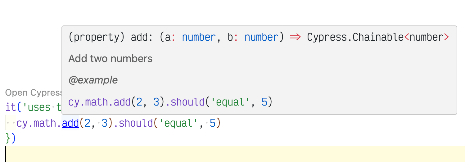 cy.math.add(2, 3).should('equal', 5)Here is how VSCode understands the cy.math.add method