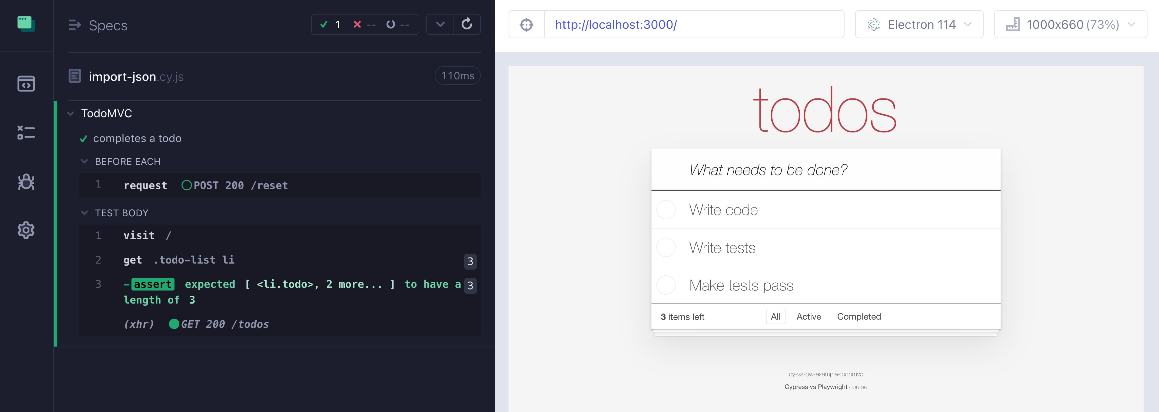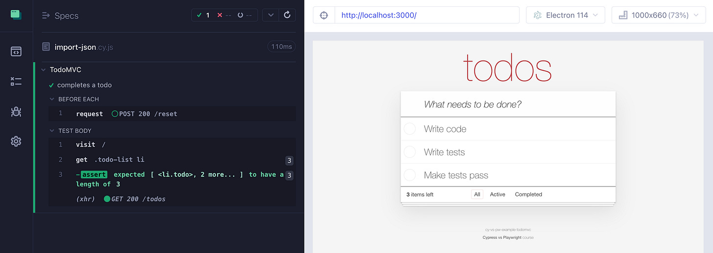 Yesterday we started using an array of “todo” items to set the initial test state with a single API network call. Let’s move the initial data into a JSON file. I will place the list of “todo” items into the fixtures/3-todos.json file.