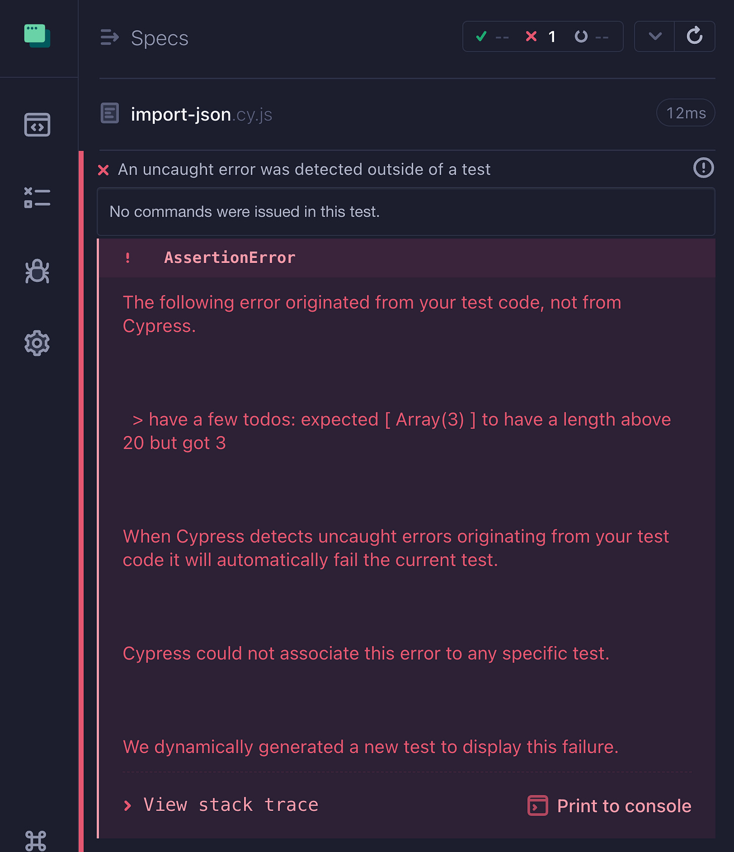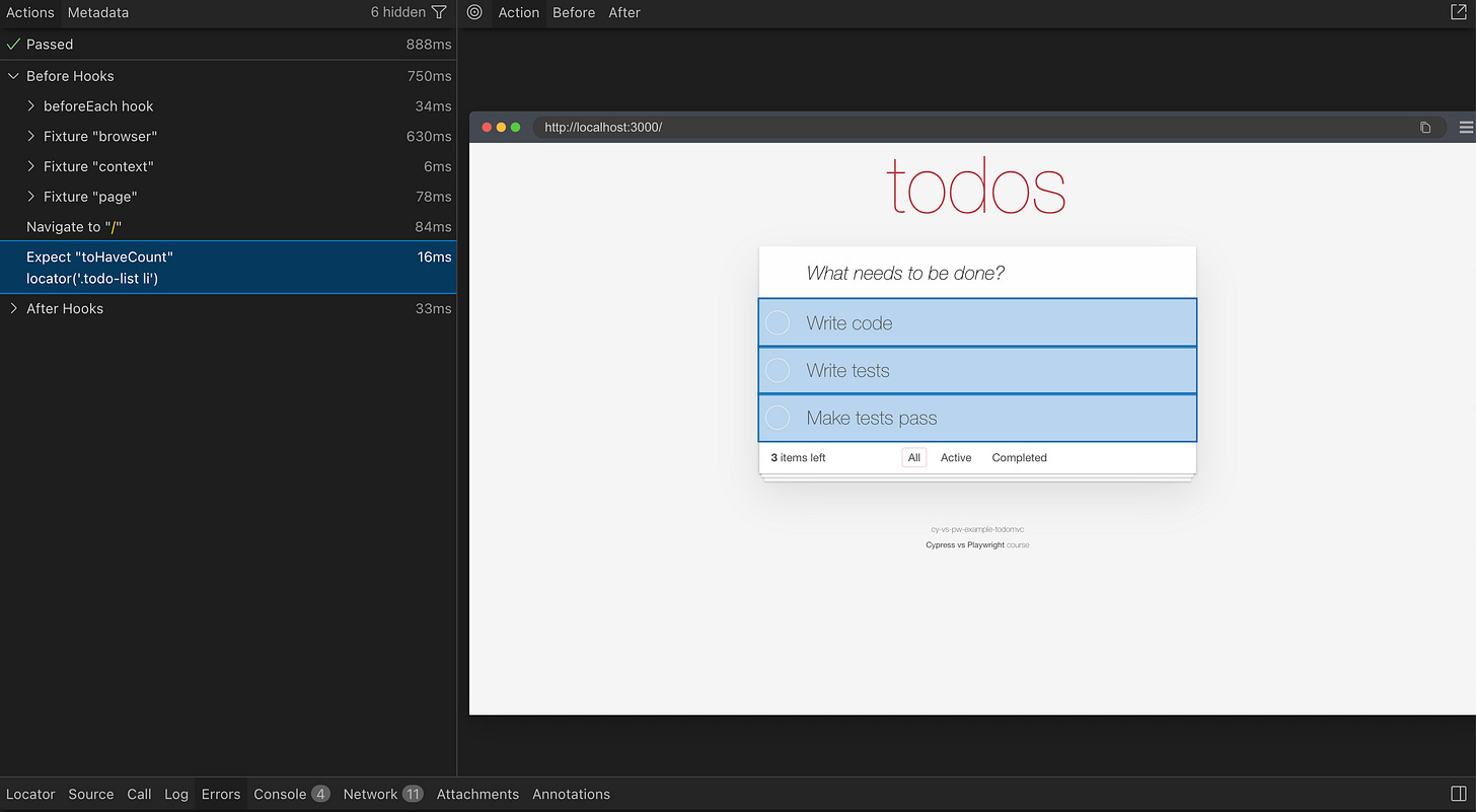 Notice that the initial assertion is outside any test and is not reflected in the Command Log, just like it is not shown in Playwright test runner.