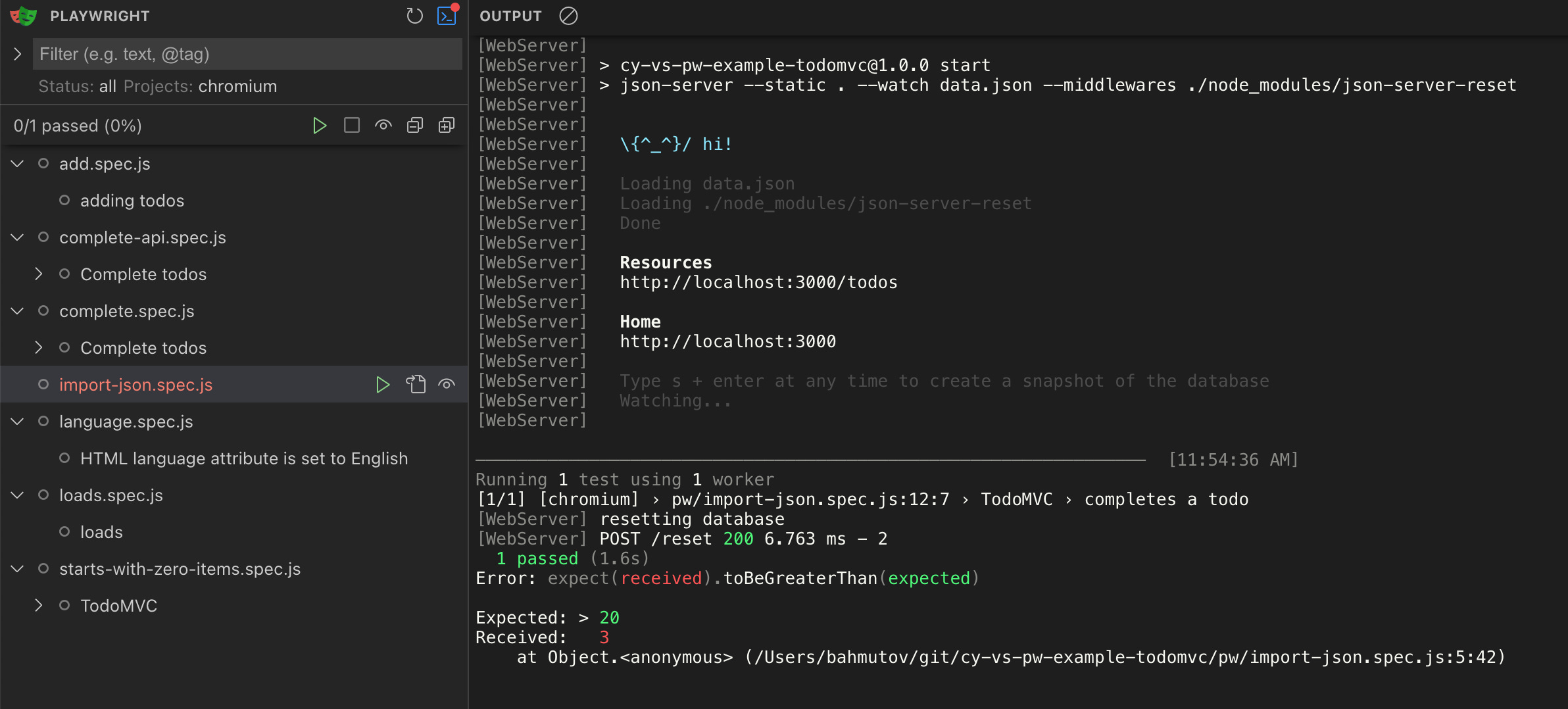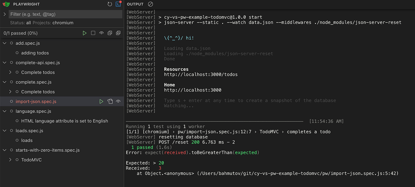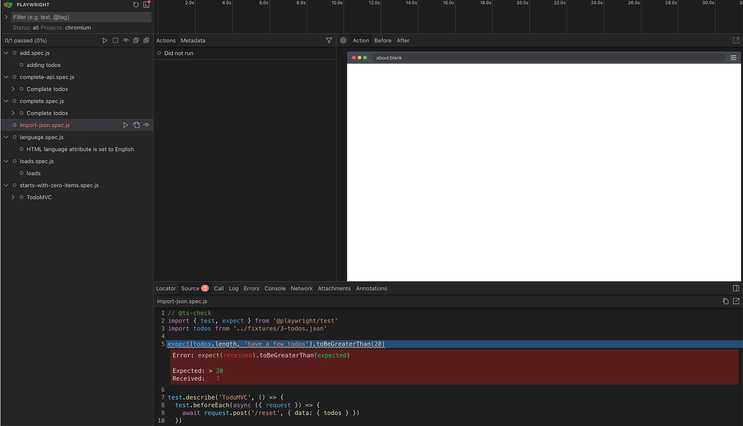 expect(todos.length, ‘have a few todos’).toBeGreaterThan(20)The terminal output view also shows this error