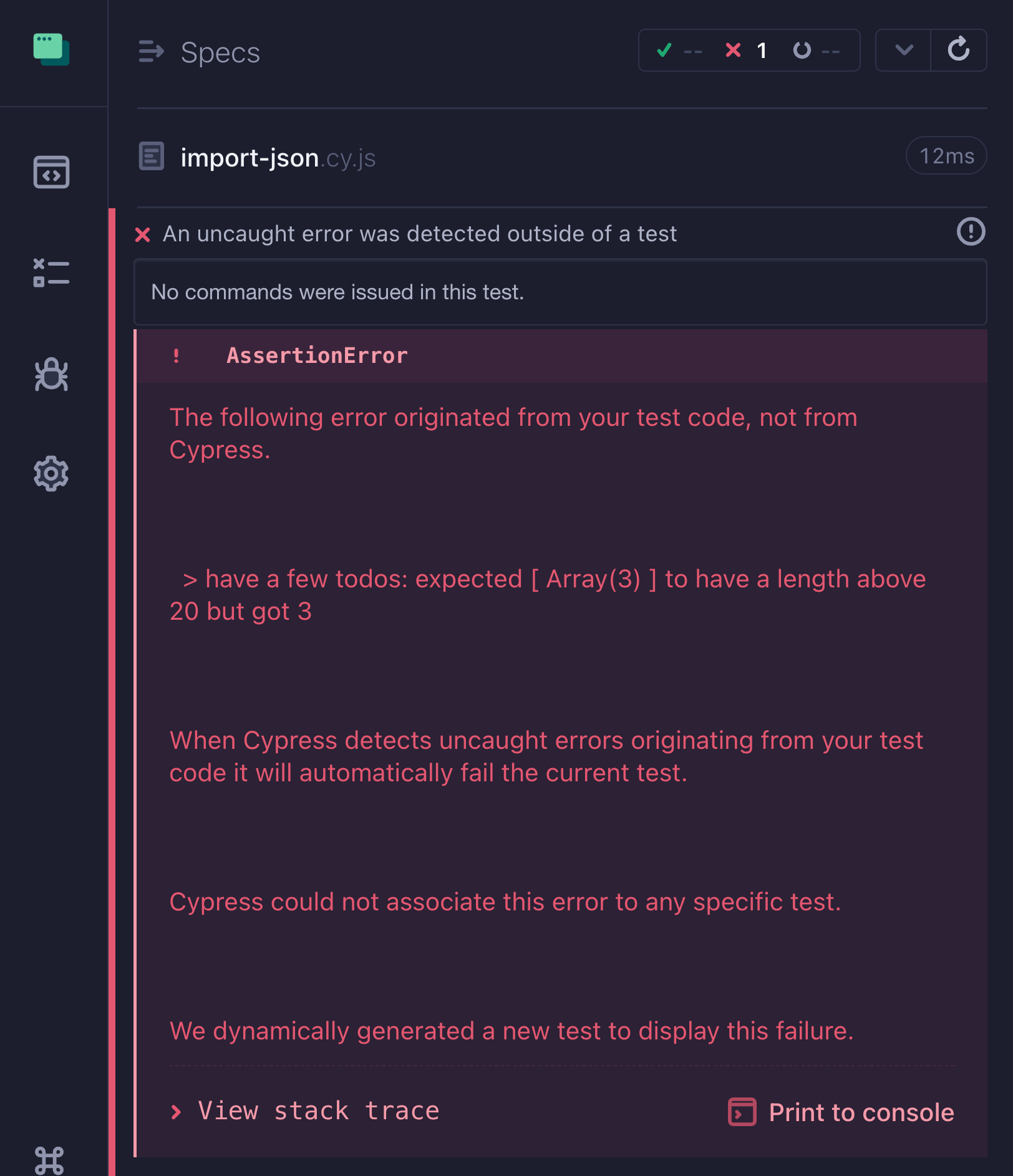 expect(todos, ‘have a few todos’).to.have.length.greaterThan(2)What’s up with test runners “losing” an assertion outside a test / test hook?! The assertion still works - you can confirm it by changing the minimum number of items to 20 for example to see it fail