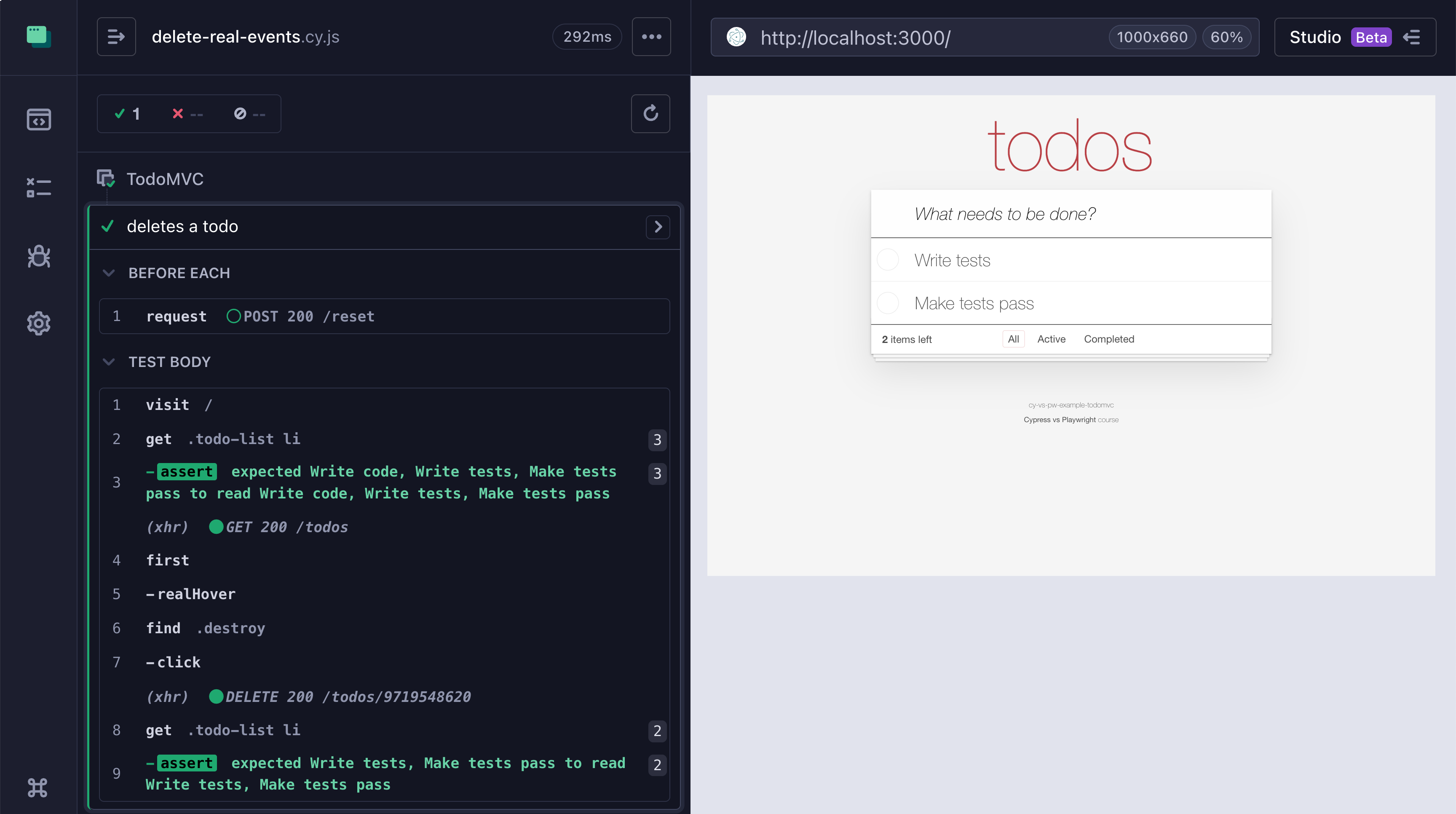 Luckily, it is easy to include a Chai library or even add a custom assertion when necessary. My plugin cypress-map includes a “should read” assertion that mimics the Playwright’s toHaveText assertion. The same test can be expressed in Cypress like this: