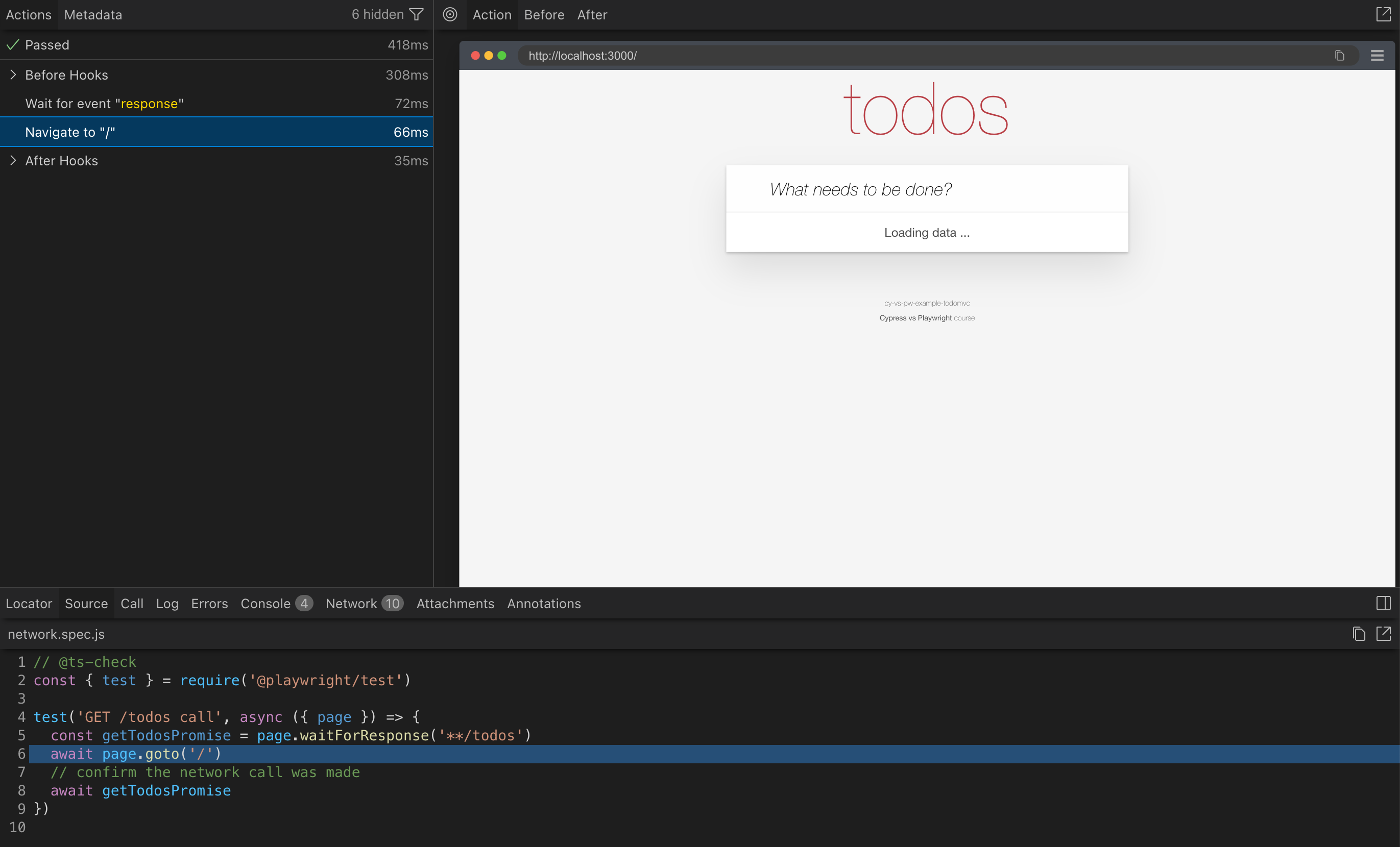 })When the network call happens, Playwright does not show it in the command log, unfortunately, so you have to guess when and if it happened.