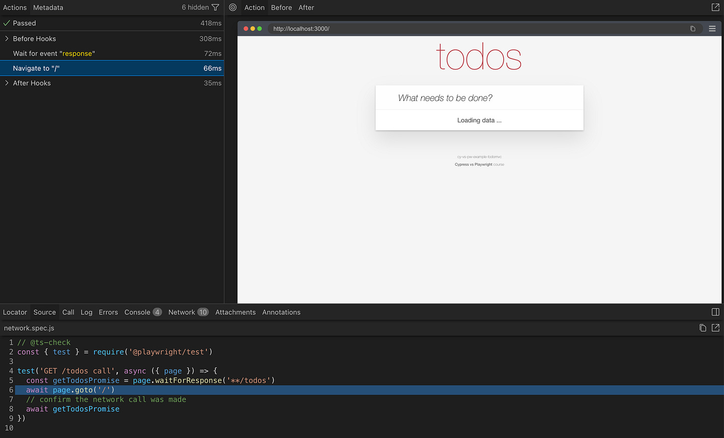 const getTodosPromise = page.waitForResponse(’**/todos’)