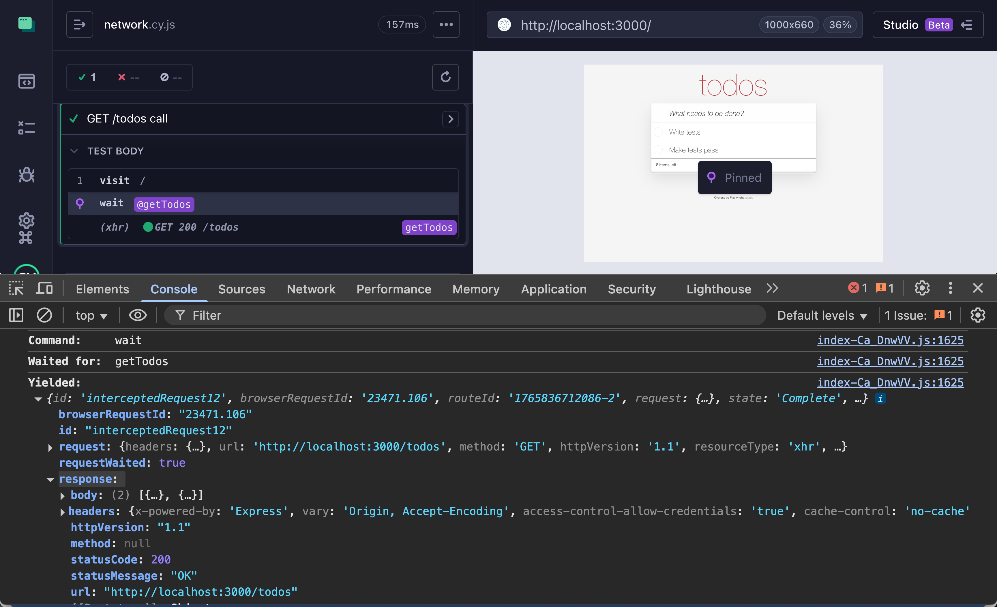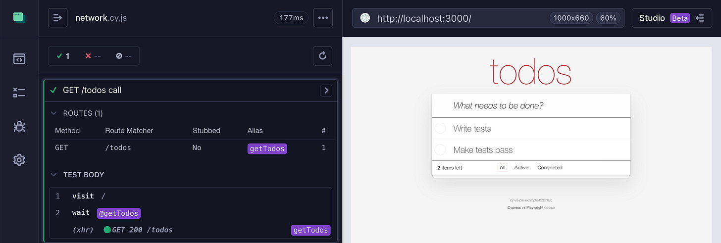 cy.intercept(’GET’, ‘/todos’).as(’getTodos’)