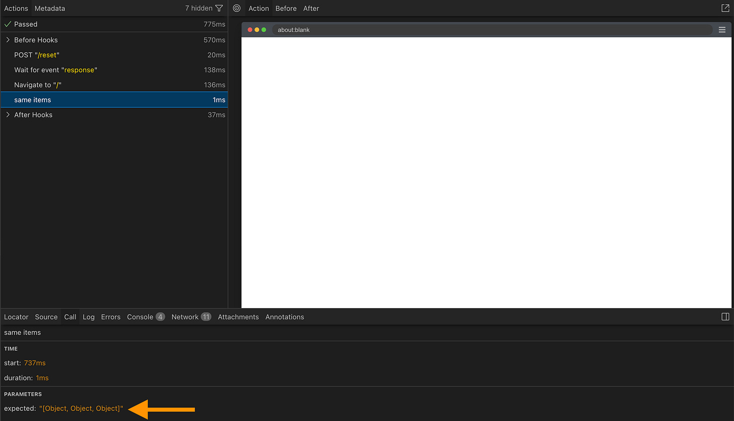 })The Playwright UI is pretty sparse and simply shows [Object, Object, Object] for the expect(items, ‘same items’).toEqual(todos) assertion.