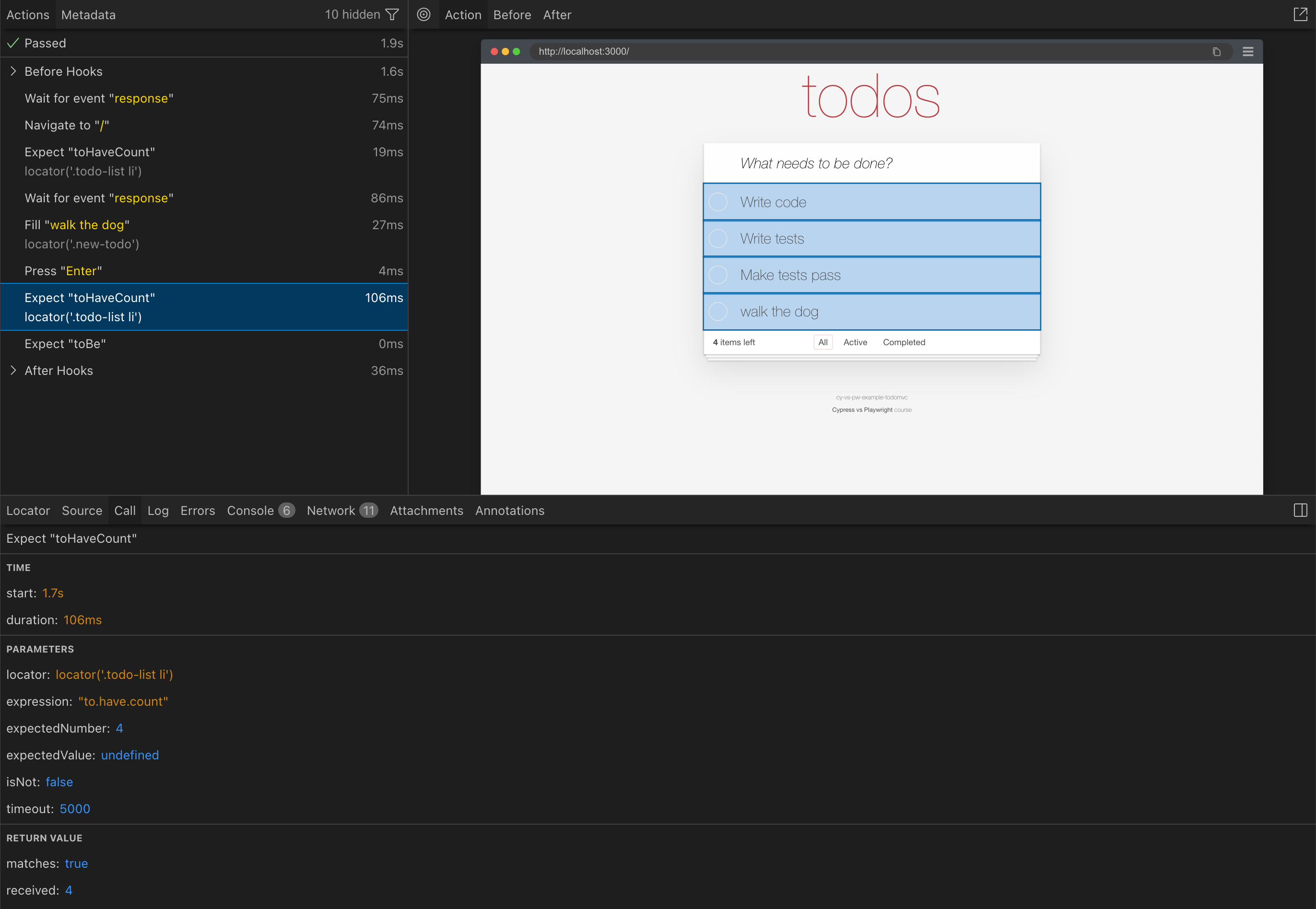 }).as('postTodos')Cypress can wait on any network alias attached to the network intercept using the cy.as command. In Playwright we need to issue more commands to define spies.