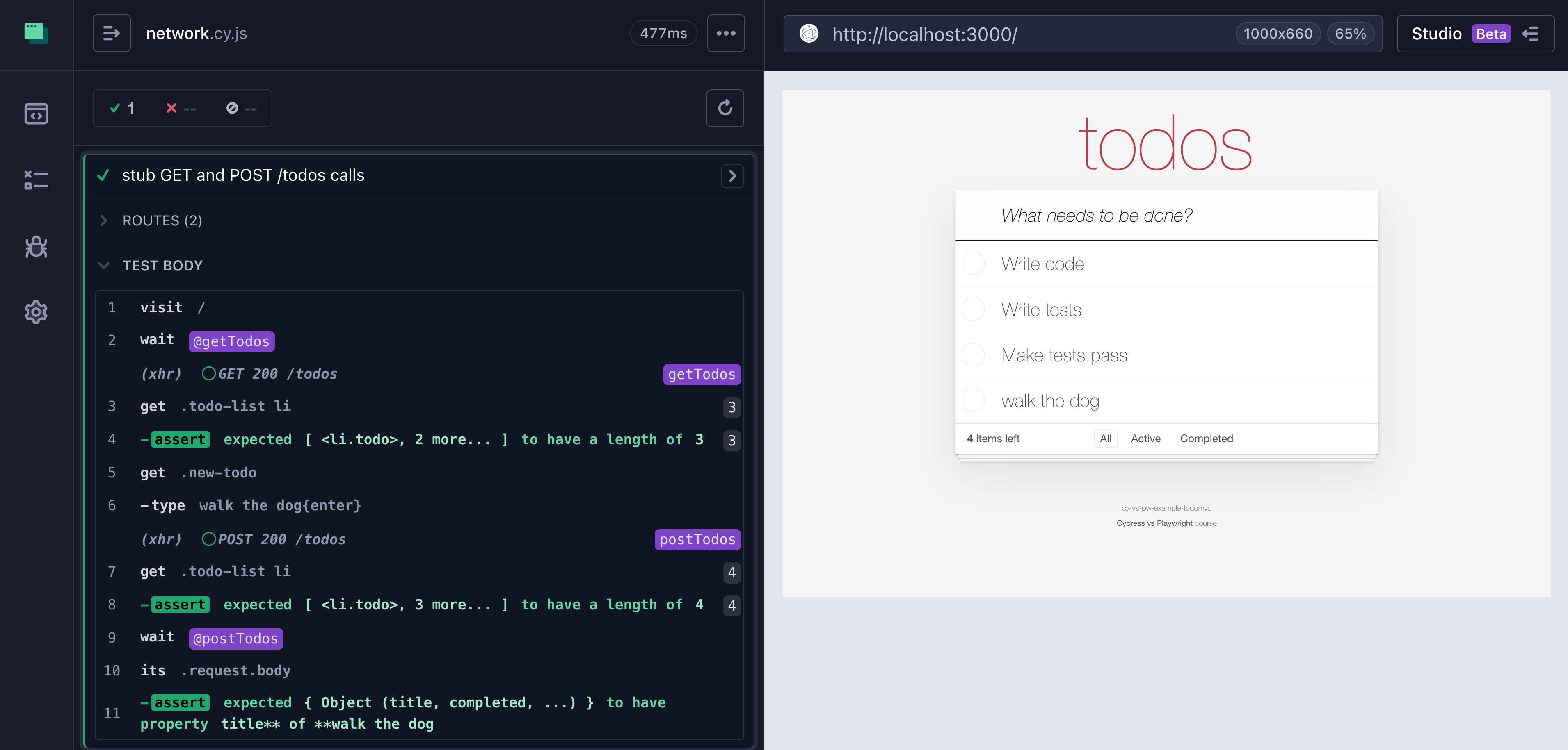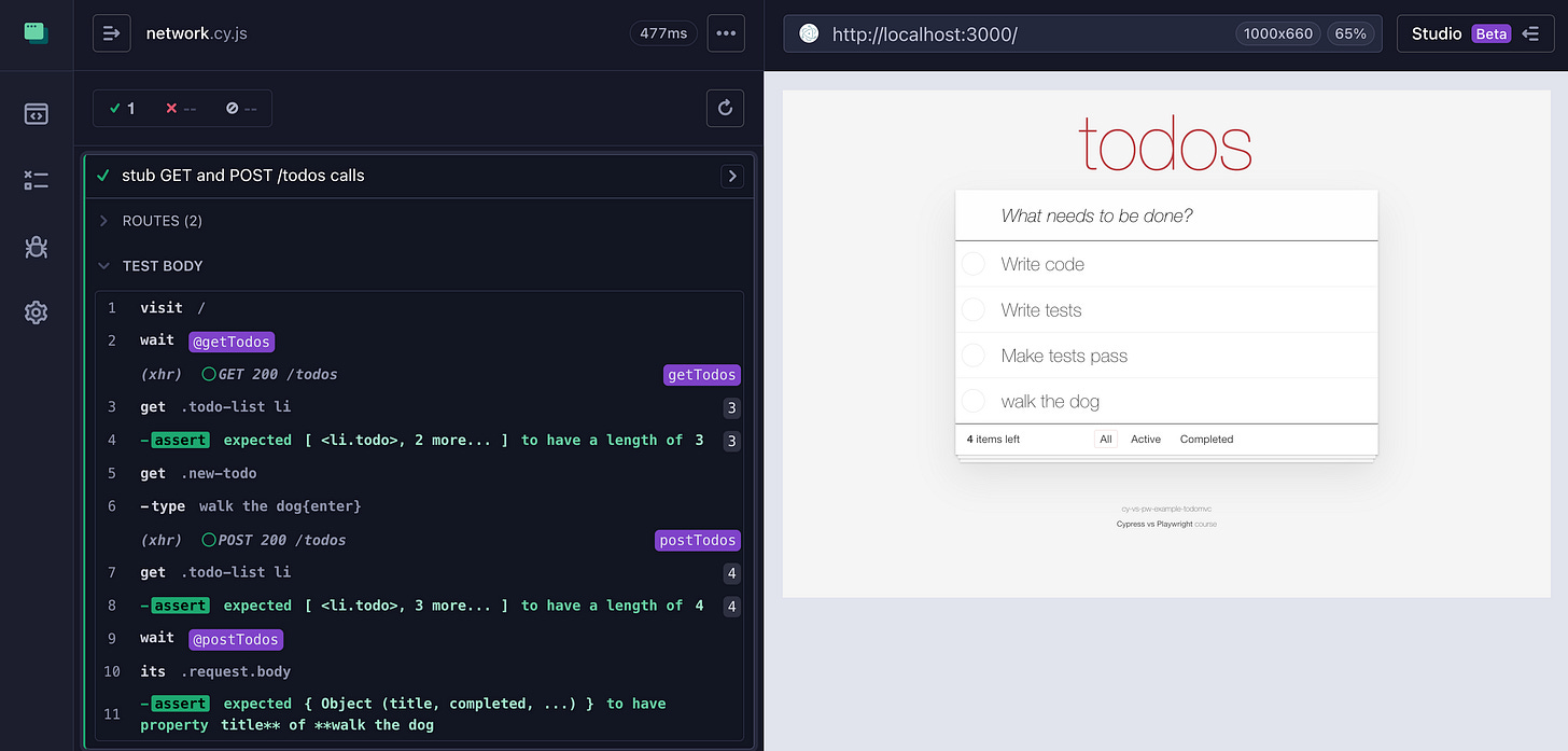 Last time we stubbed the GET /todos API call the application makes on load. When the user enters a new “todo” item, the application makes a POST /todos call and sends an object with the “todo” title and some other information. Let’s stub both the GET and POST calls and confirm the app works correctly.