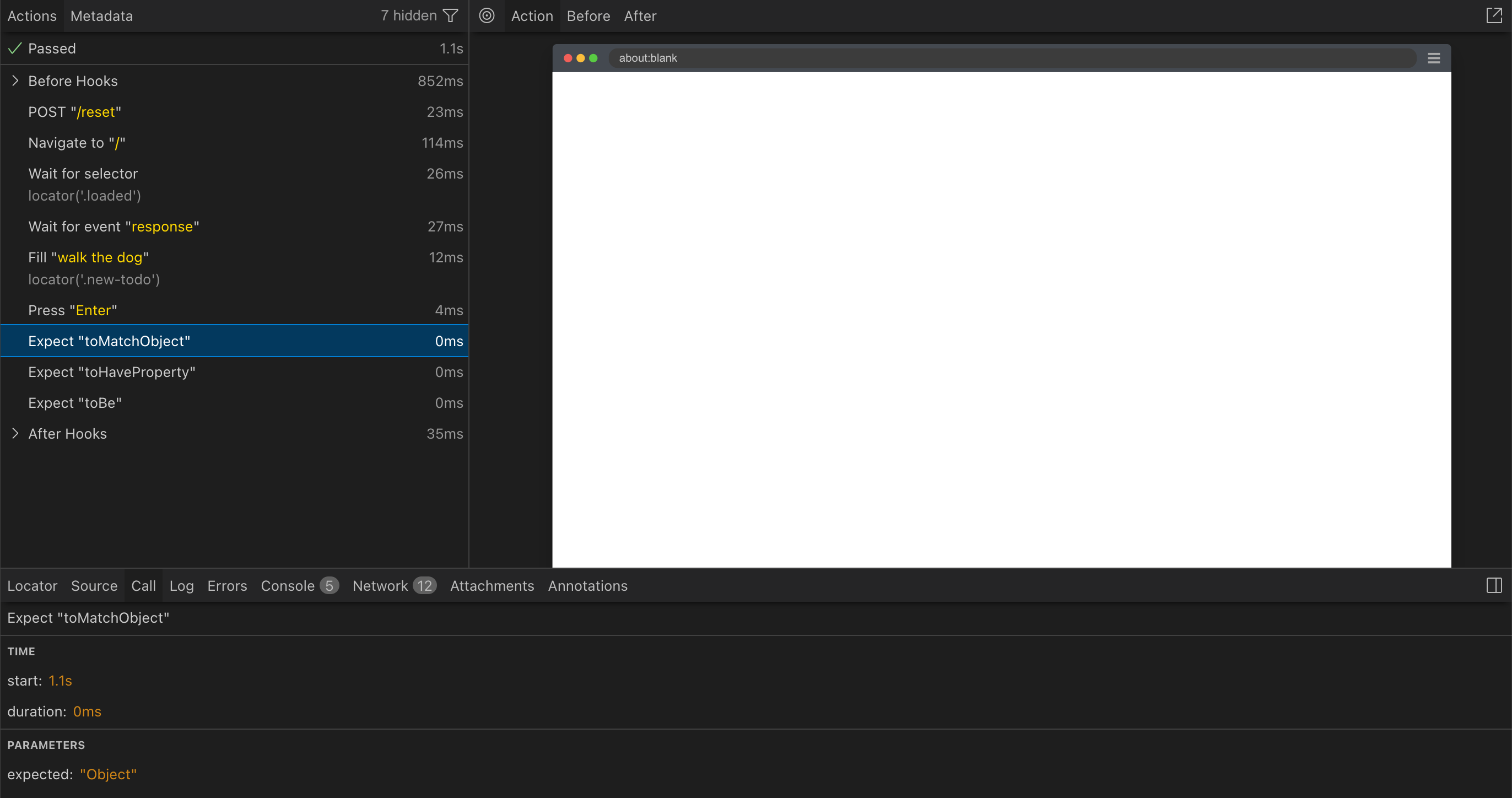 })The test passes, but each assertion for checking the sent object is pretty minimal in its UI. For example, “toMatchObject” simply shows “expected: Object” text, but not the expected matcher or the actual object.