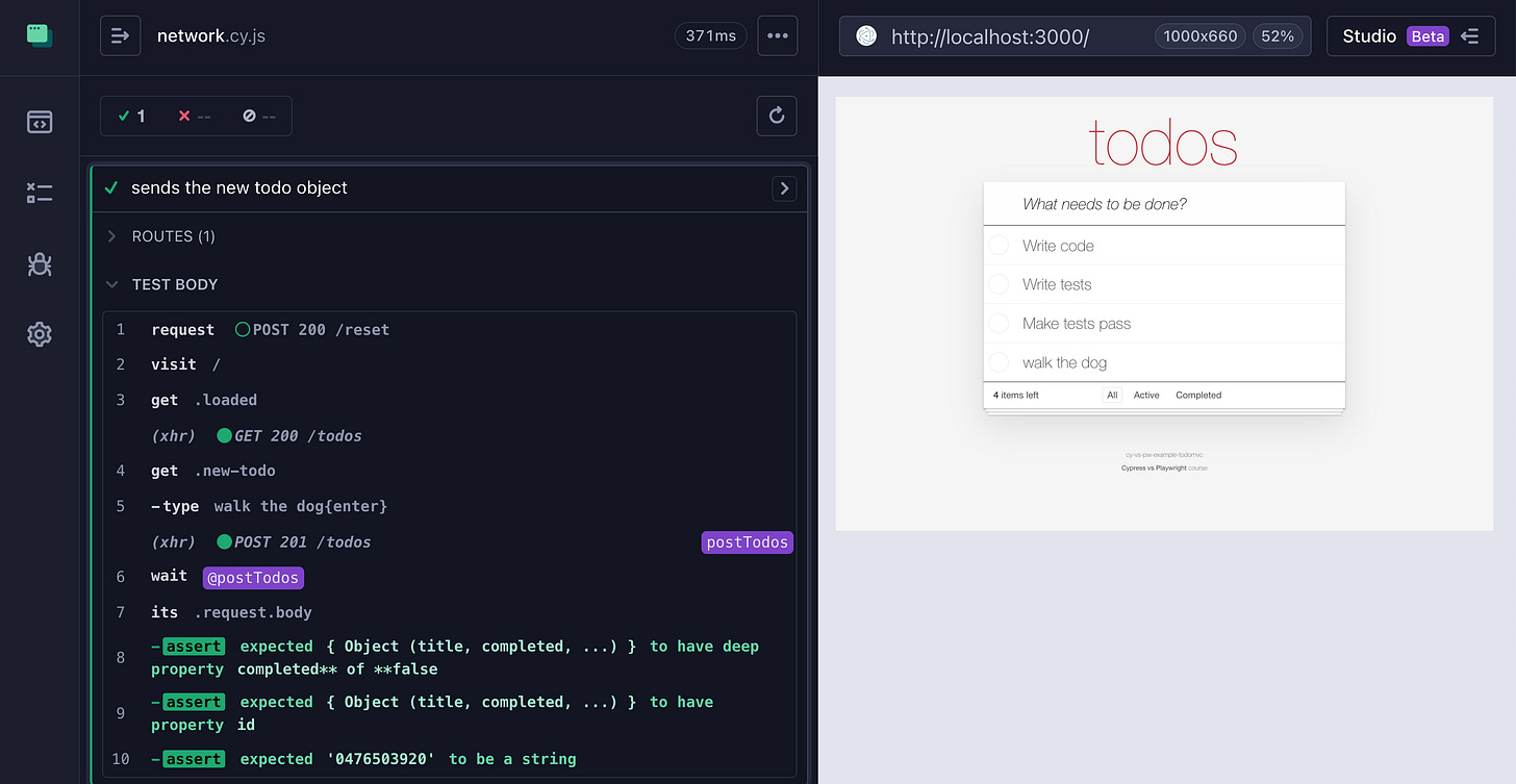 })Let’s look at the passing test: the network calls, commands, and assertions are shown in the Command Log in the order they happen