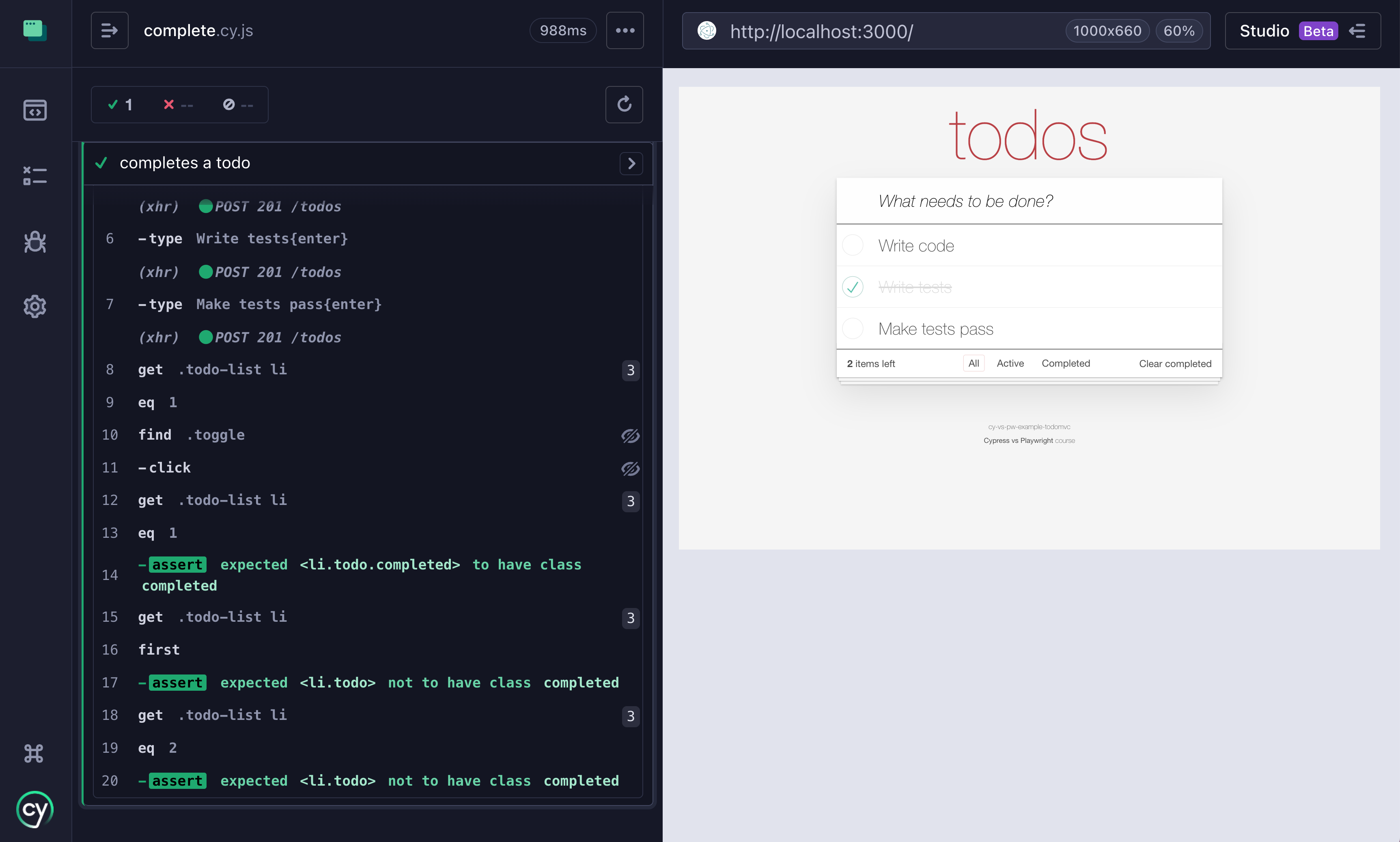 })The test is green, and each class name could be checked individually using the .should(’have.class’, ‘completed’) assertion.
