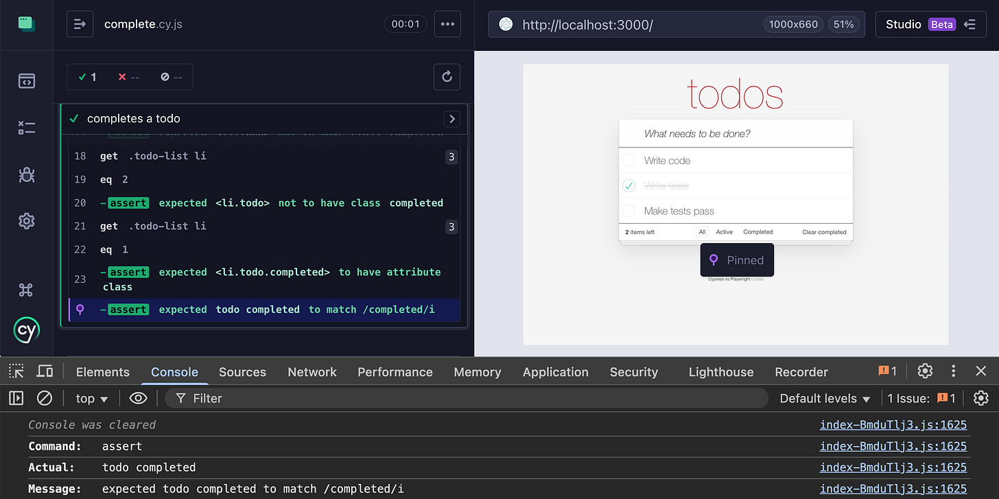 .should(’match’, /completed/i)We can see the value yielded by the .should(’have.attr’, ‘class’) assertion by clicking on the assertion in the open test runner
