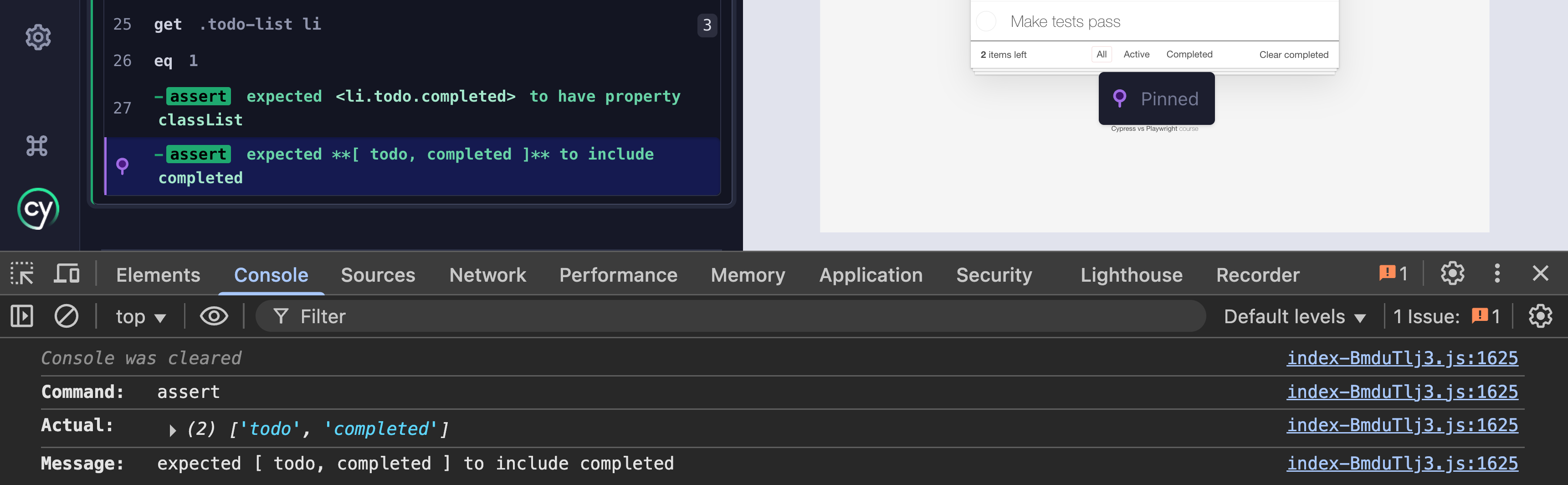.should(’include’, ‘completed’)Of course, the value of the Array can be dumped into DevTools console by clicking on the assertion with the Test Runner open