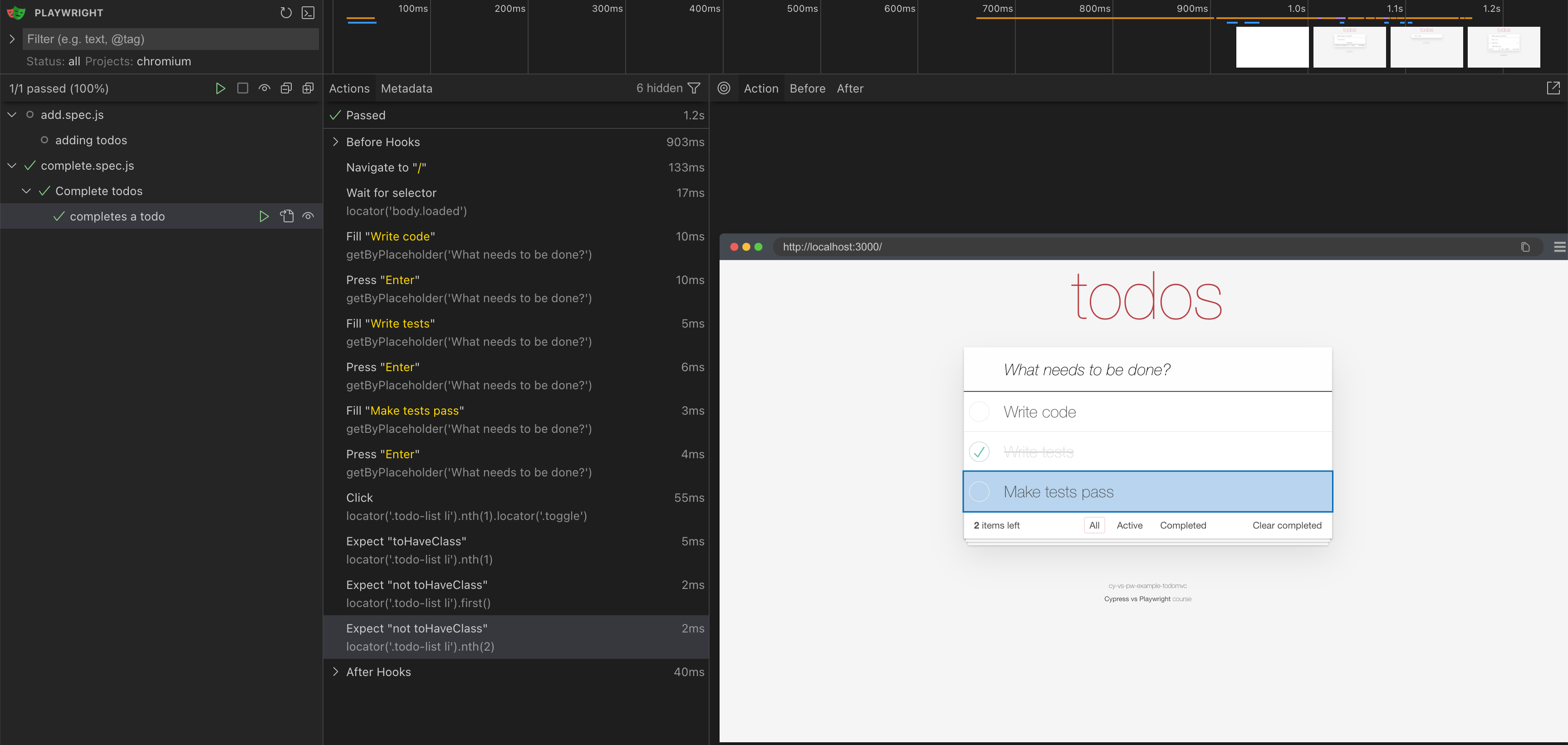 The class check assertion .toHaveClass(/completed/) uses a regular expression because there are several classes on each element: “todo completed”, and by default the assertion checks the entire string! Thus we cannot check a single class presence and instead treat the class attribute as a string that can be checked against the regular expression.