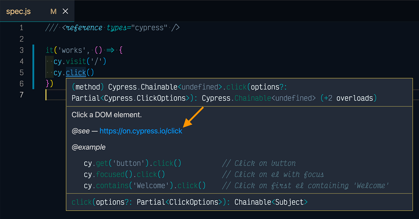 Cypress documentation site has a nice little feature to prevent deadlinks from floating around. All internal and shared links are routed through “on.cypress.io” service that redirects to the current deployed page. For example, each command has an “on.cypress.io/<command>” redirect. Do you want to open the documentation page for “cy.click”? Type “on.cypress.io/click” and voilá - you end up at the “https://docs.cypress.io/api/commands/click” page.