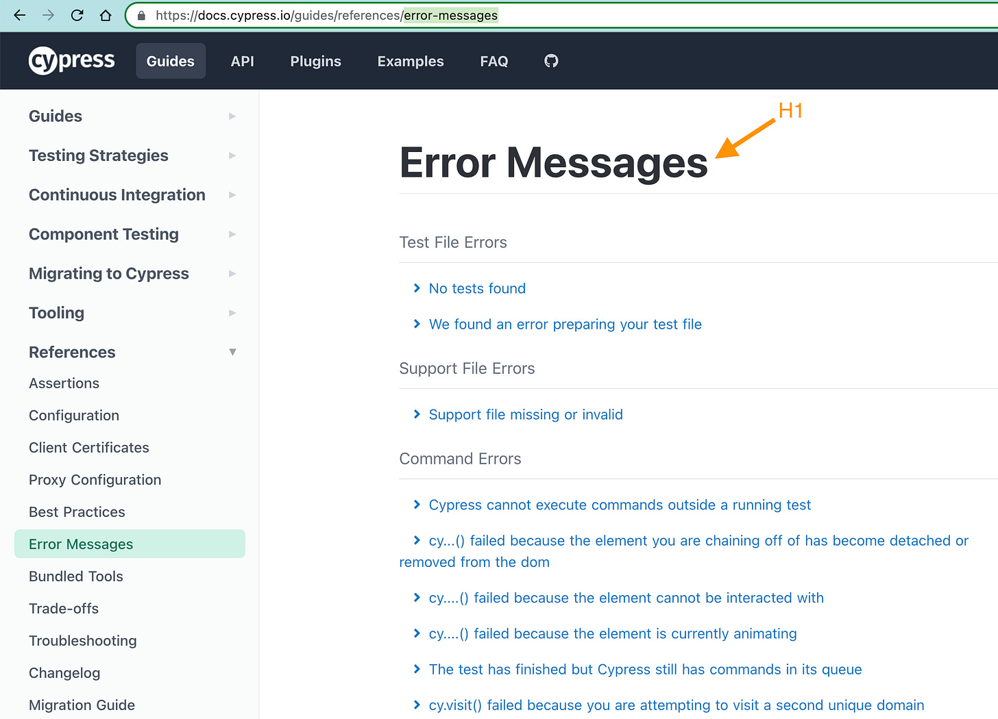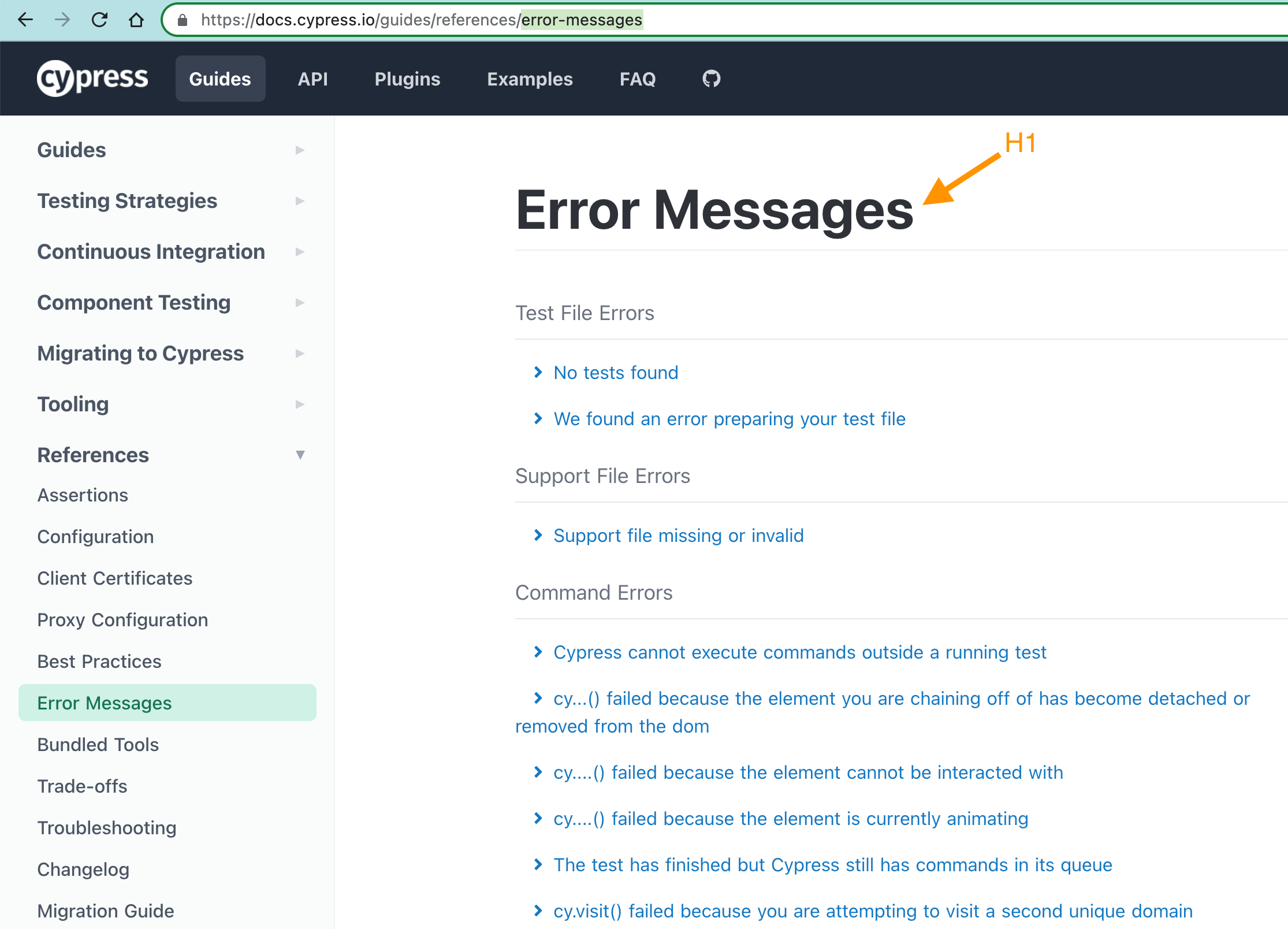 In general, every page title can be used as an “on” redirect if you take the H1 title, convert it to lowercase, and use dashes instead of spaces. For example, the “Error Messages” page below is reachable via the “on.cypress.io/error-messages” permanent URL.