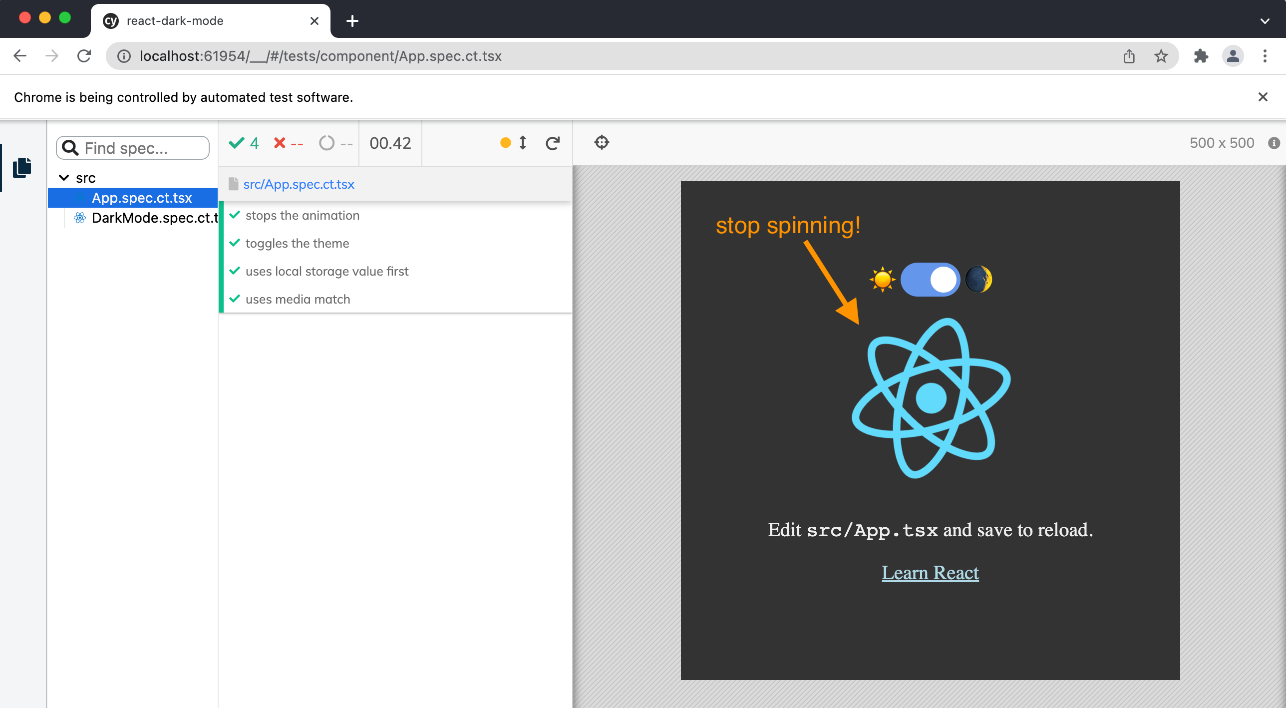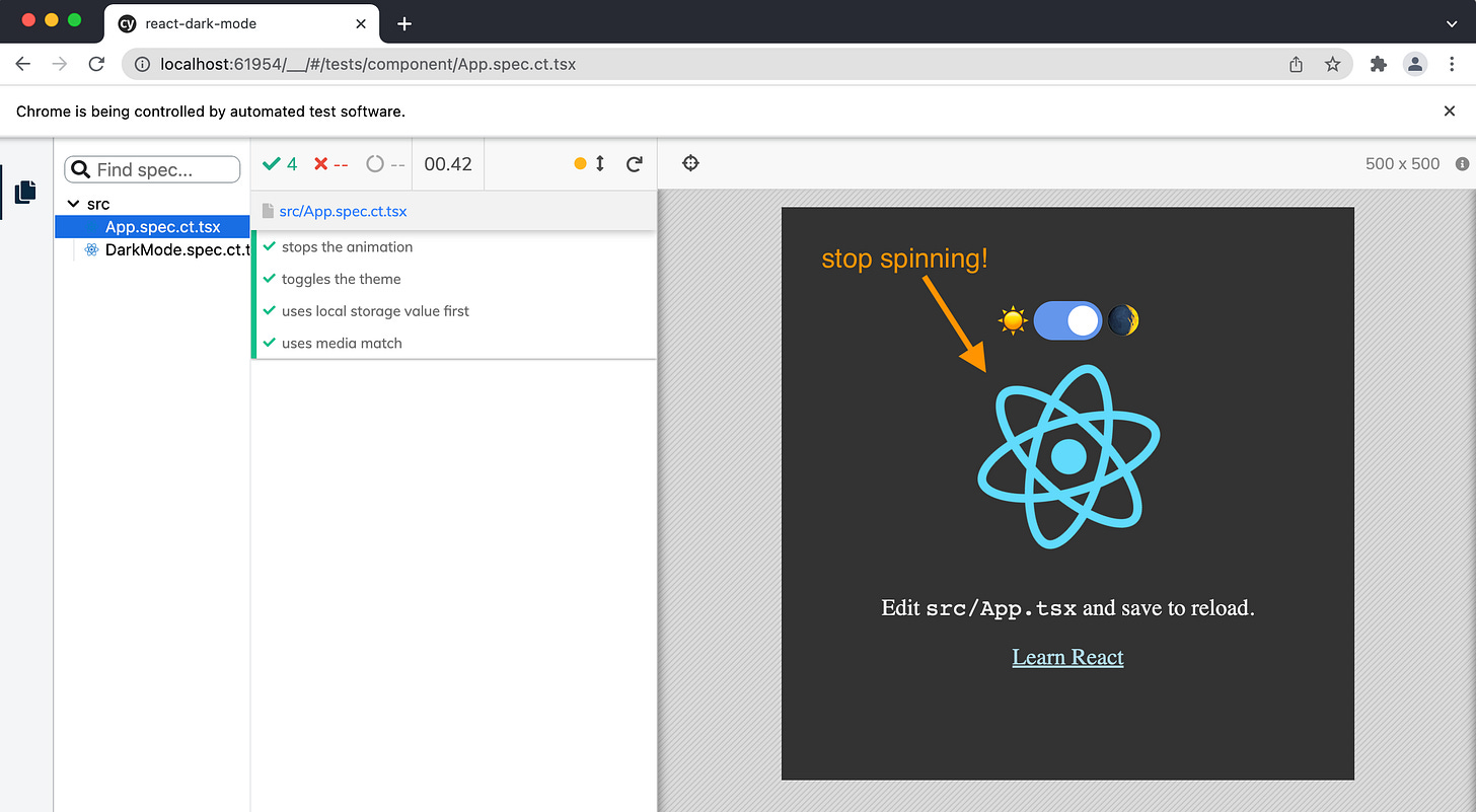 I was reading “How to Create a Dark Mode Component in React” post, and thought to myself “what a great example to show Cypress component testing on!” In the future videos I will explain setting up the component testing in the project repo bahmutov/react-dark-mode, but for now, you can see one particular use case: overwriting the component’s CSS when mounting to freeze the spinning logo.